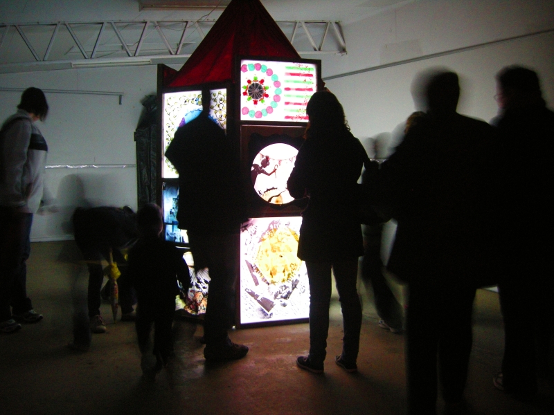 Carousel, interactive hexagonal piece 2m high x 2m diameter, perspex, mixed media, rotating light, soundscape.